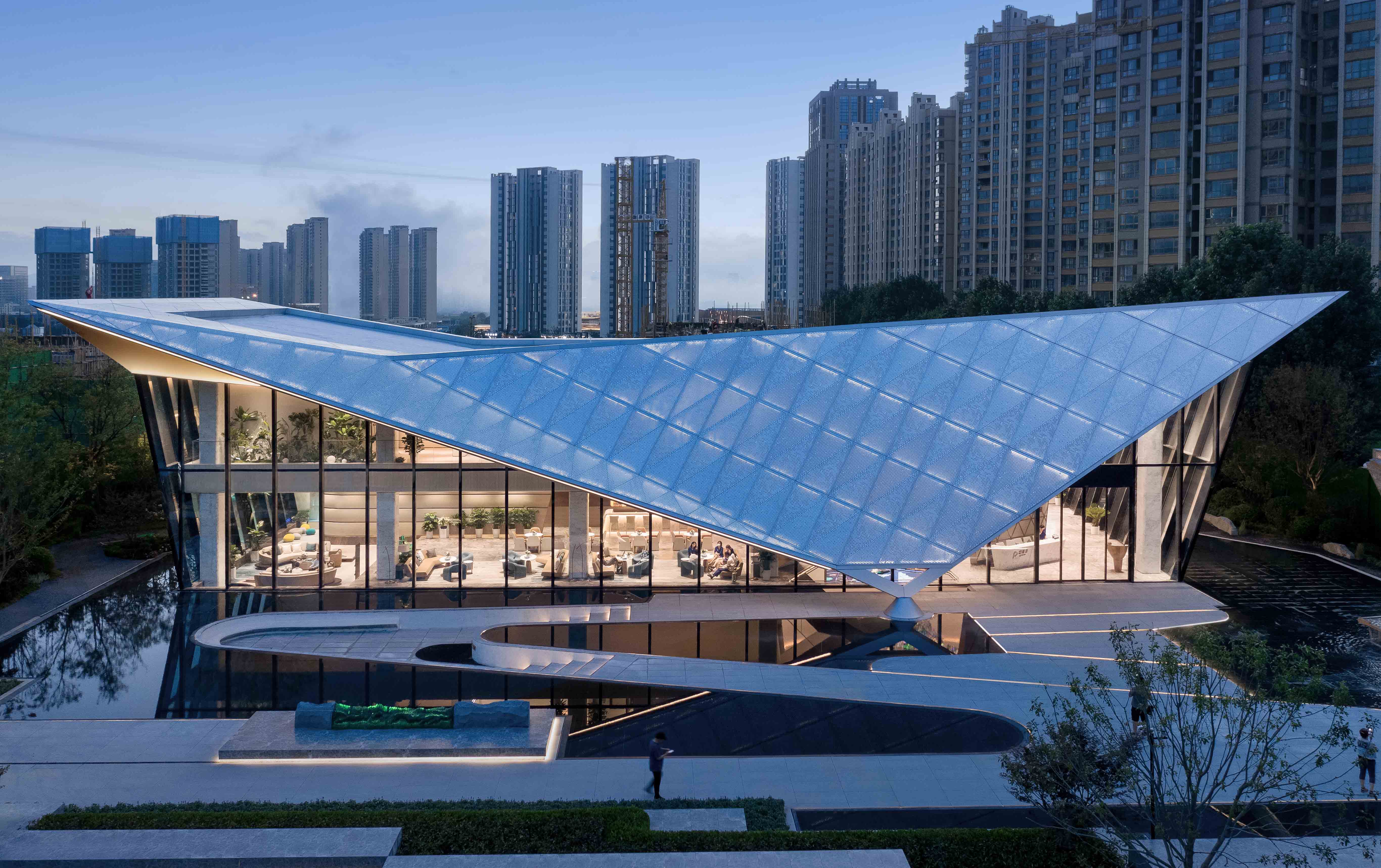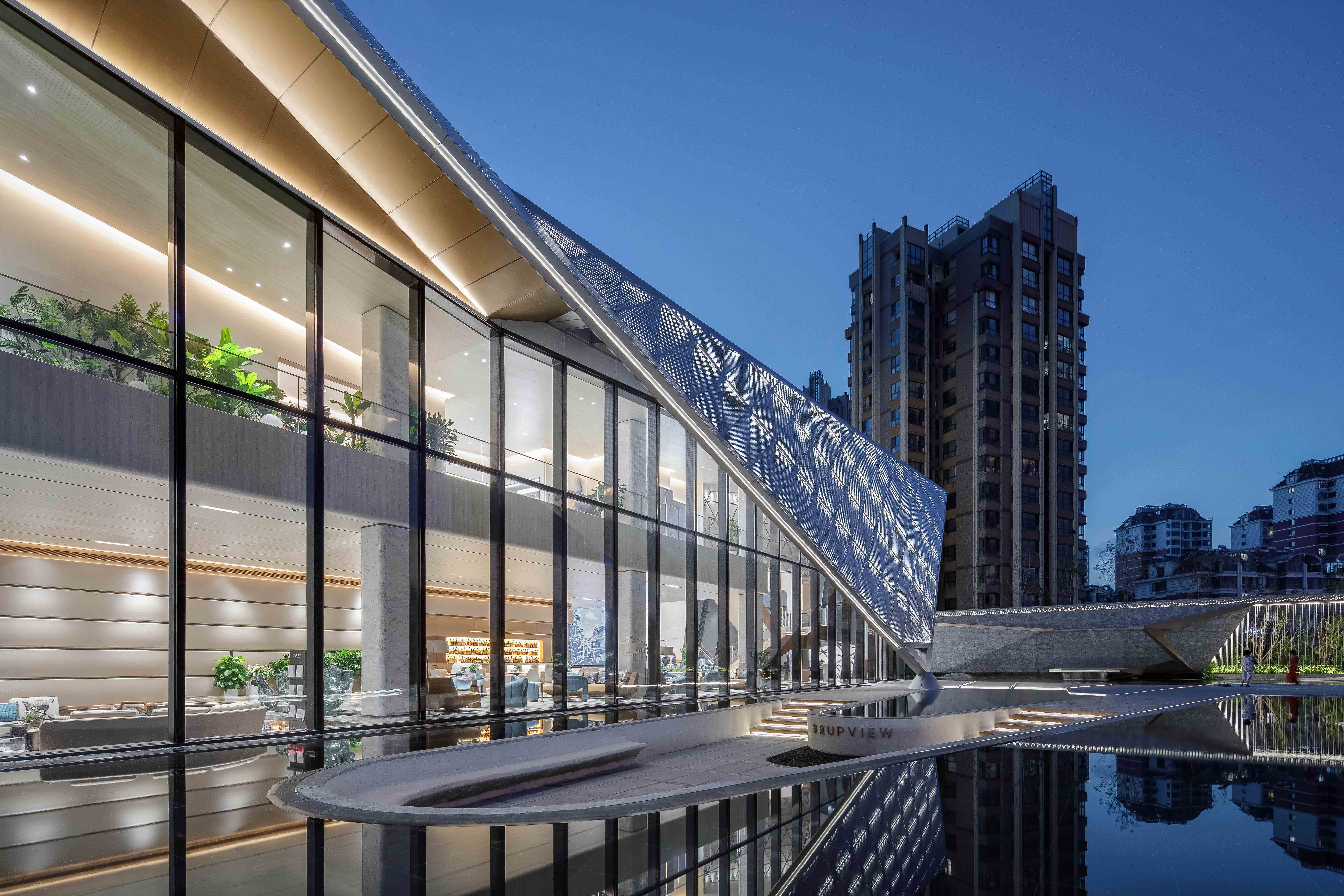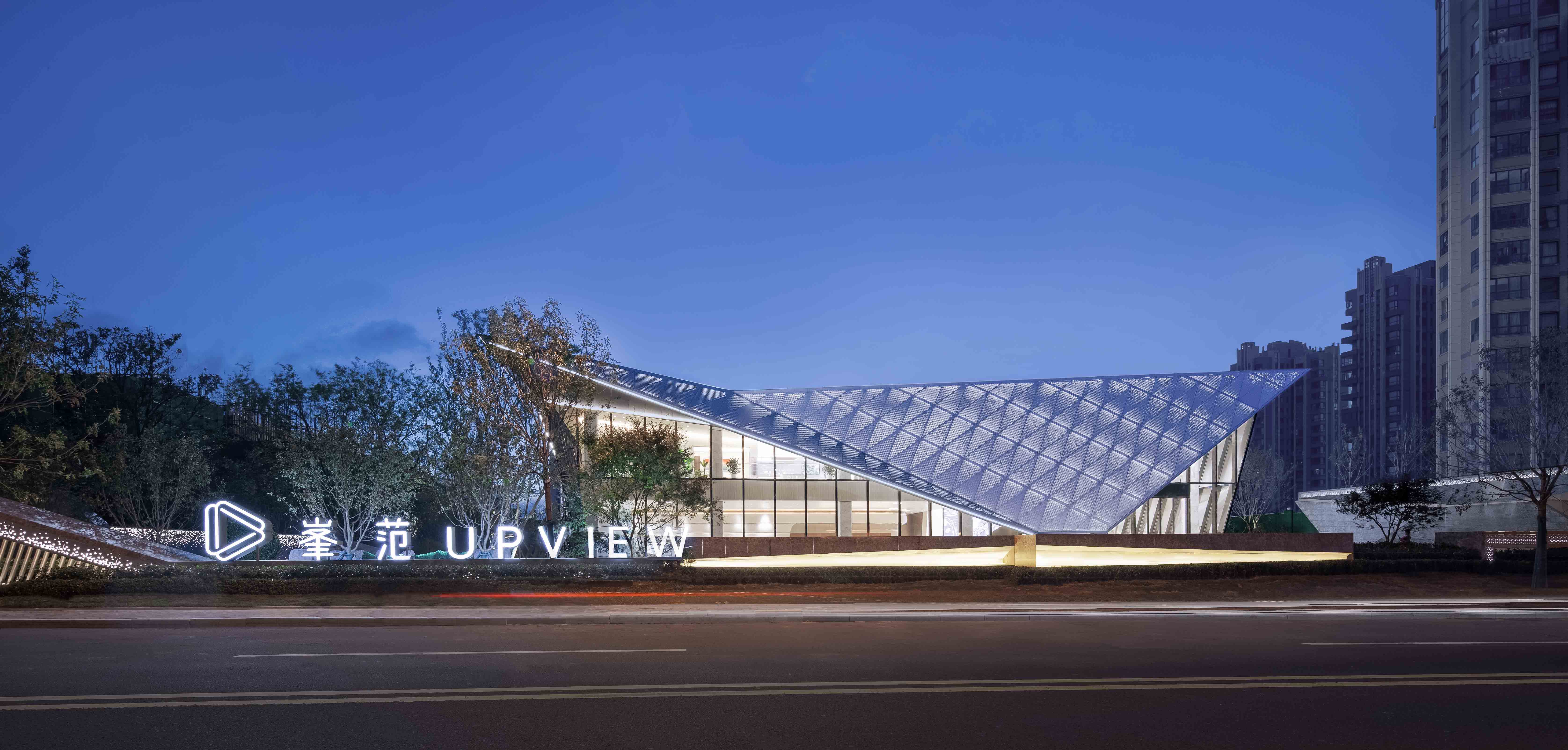 主体“鲸鳍”由双面花纹镂空肌理的三角铝板组合而成。灯具隐藏在内衬板与表皮的夹层中,灯光洗亮夹层半透光卡乐板背板,通过穿孔花纹透出柔和光线,同时因为夹层是半透光的材质,室内亦可欣赏表皮的灵动灯光。灯光通过现场动画编程,效果如月光洒落水面映起的波光一般。动态的灯光效果使建筑在夜间更具生命的活力。