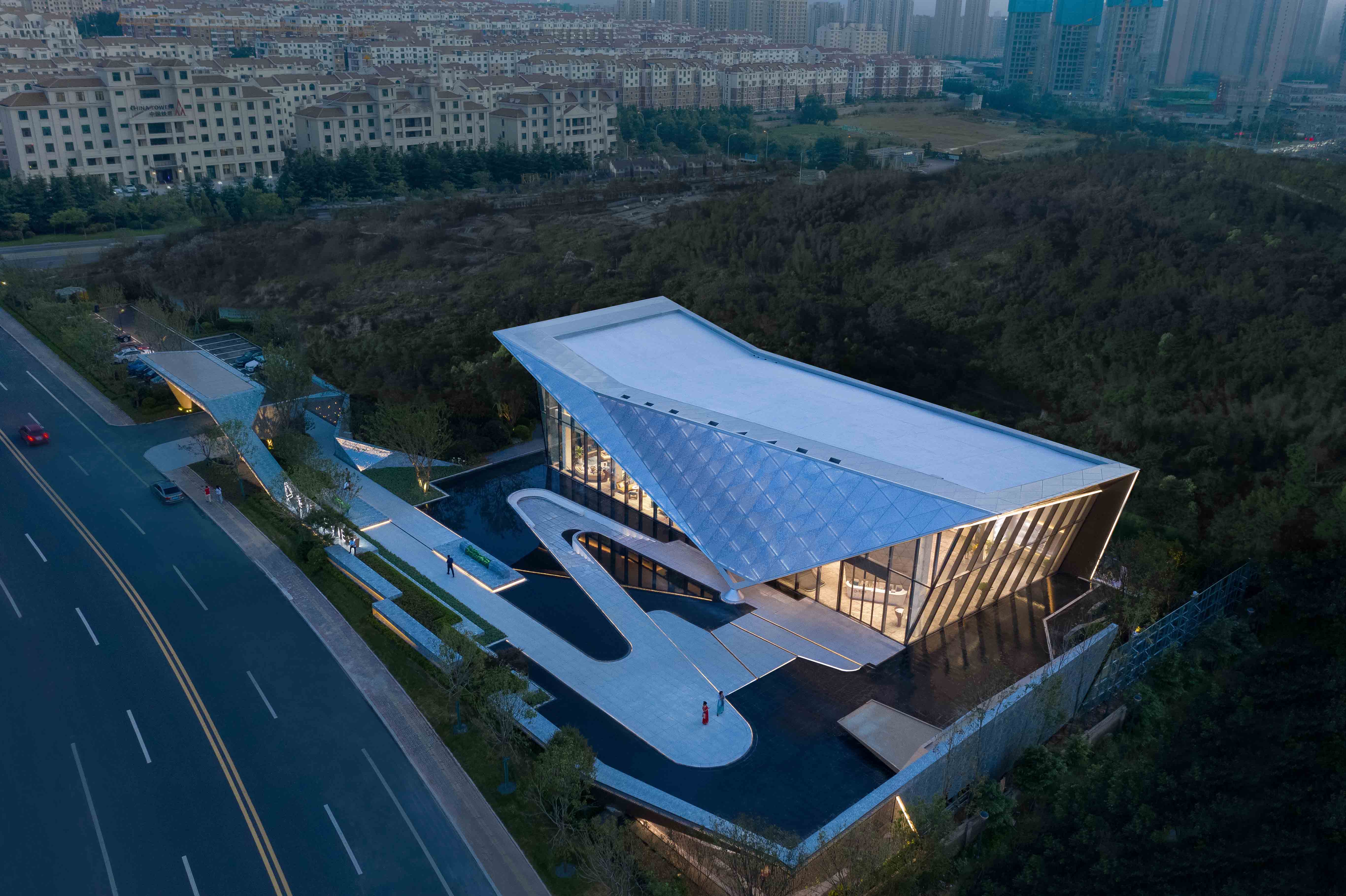 建筑如海面跃起的鲸鱼为意向,象征海洋与波光的蓝灰色屋顶为建筑整体设计基调并展现独特的设计肌理。折线形的屋顶与周边海域融为一体,营造与自然环境共生相合的体验。灯光设计遵循“生物”体征与环境特色,模拟月光在夜幕笼罩的前夕为鲸鱼披上层层鳞光,流萤的光泽变换荡漾着水纹波澜。伴随月光散落在景观湖面的层层涟漪,建筑与自然相互辉耀。呈现建筑鲸鱼跃水过程中流淌在表皮上波光粼粼的生动画面。将仿生与自然的氛围以全新直观的形式再度表现。