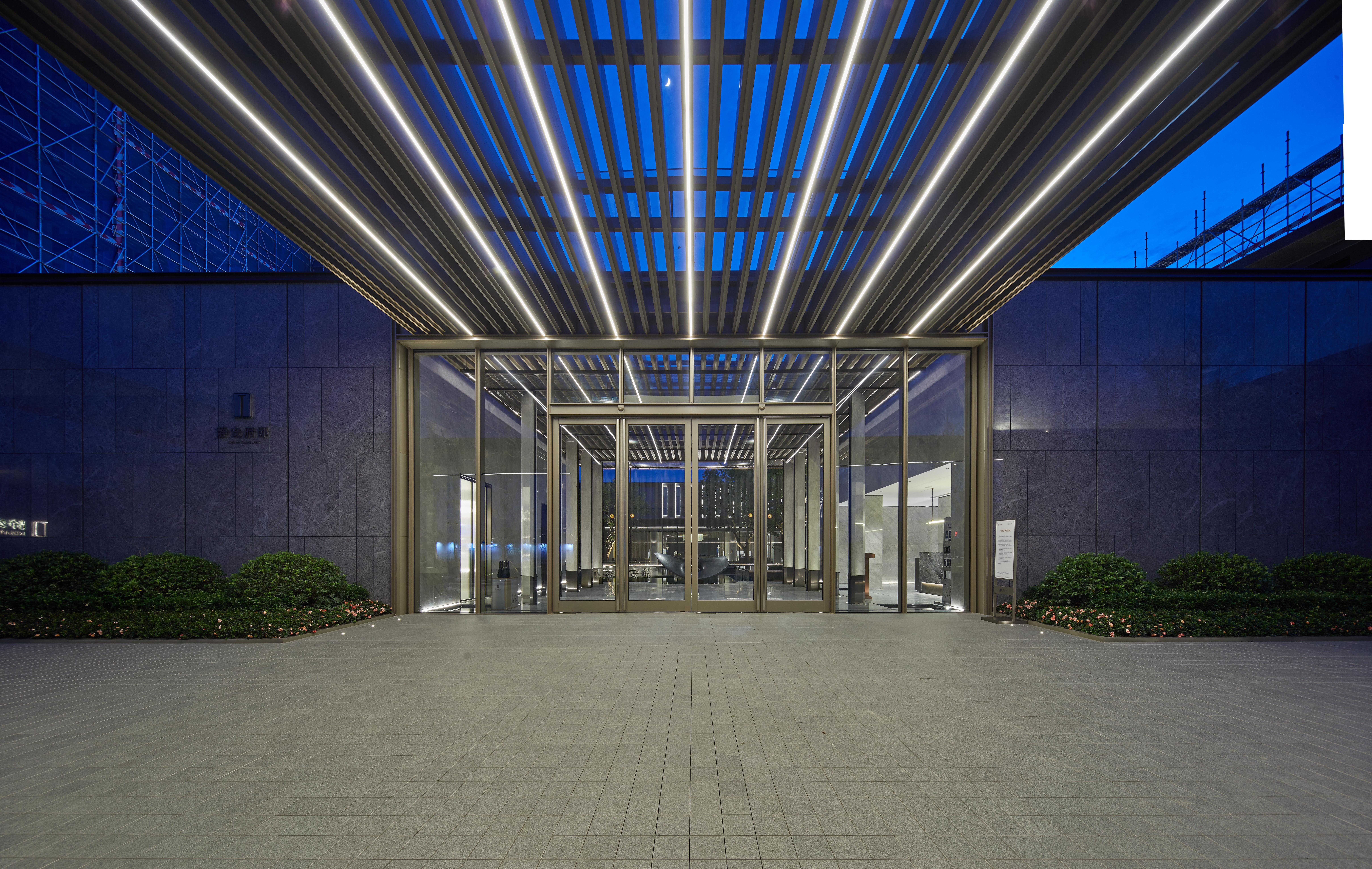 走过短暂的游廊,视线便豁然开朗。主体建筑临水而立,出挑的底部幕墙结构令建筑仿佛是漂浮在水面,竖向灯光线条展现立面的轻盈与挺拔,柔和的反射光营造宁静悠远的空间意向。幕墙和环绕的抄手游廊在灯光上产生呼应,令空间浑然一体。