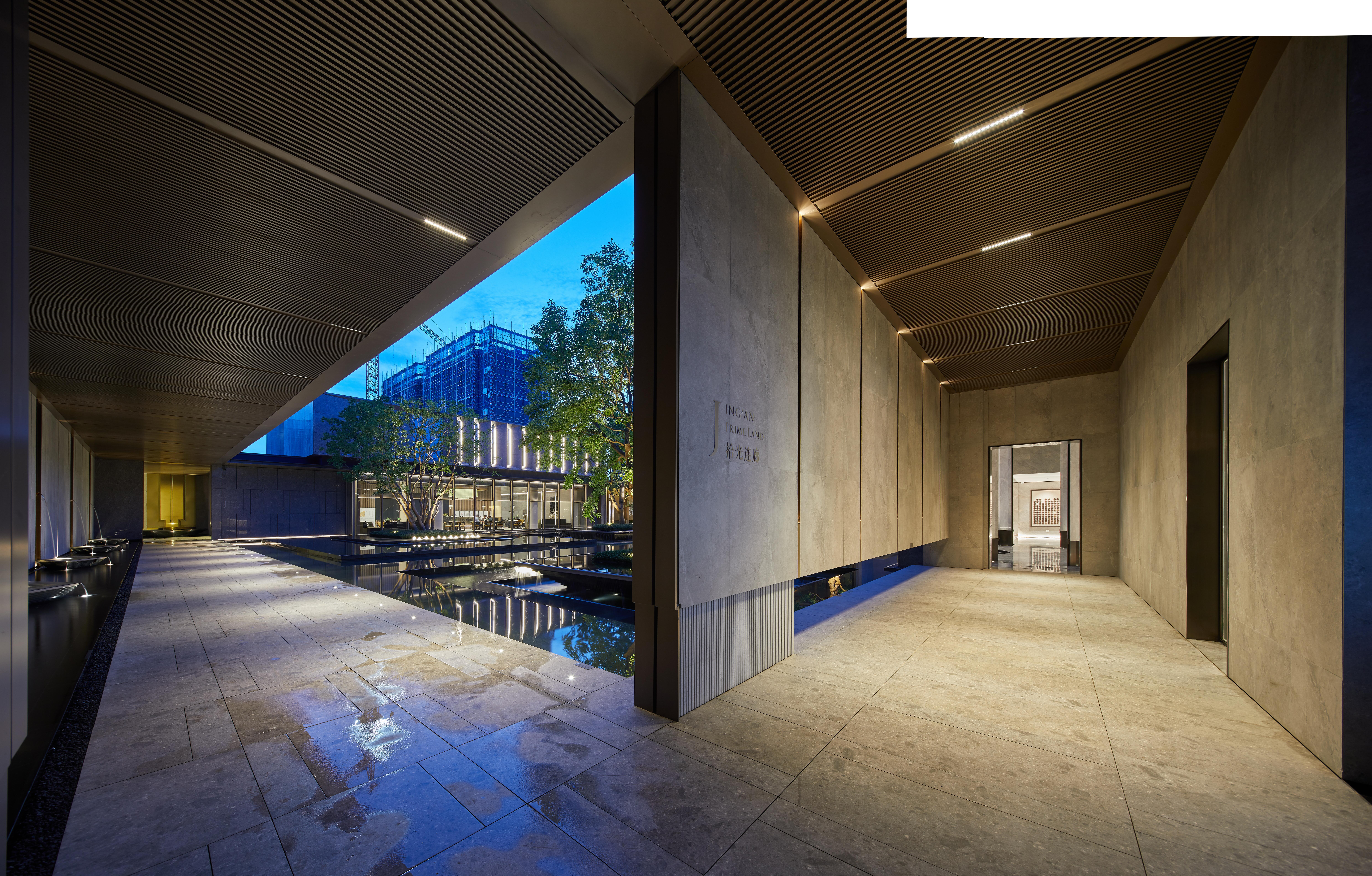 示范区的入口采用对称阵列表达礼序和仪式感,雨棚的天花具有强烈的方向性,引导人流向内聚集,而无缝拼接的灯光以及玻璃上的反射则进一步强化了这种意向,渲染“向内吸引”的环境氛围。