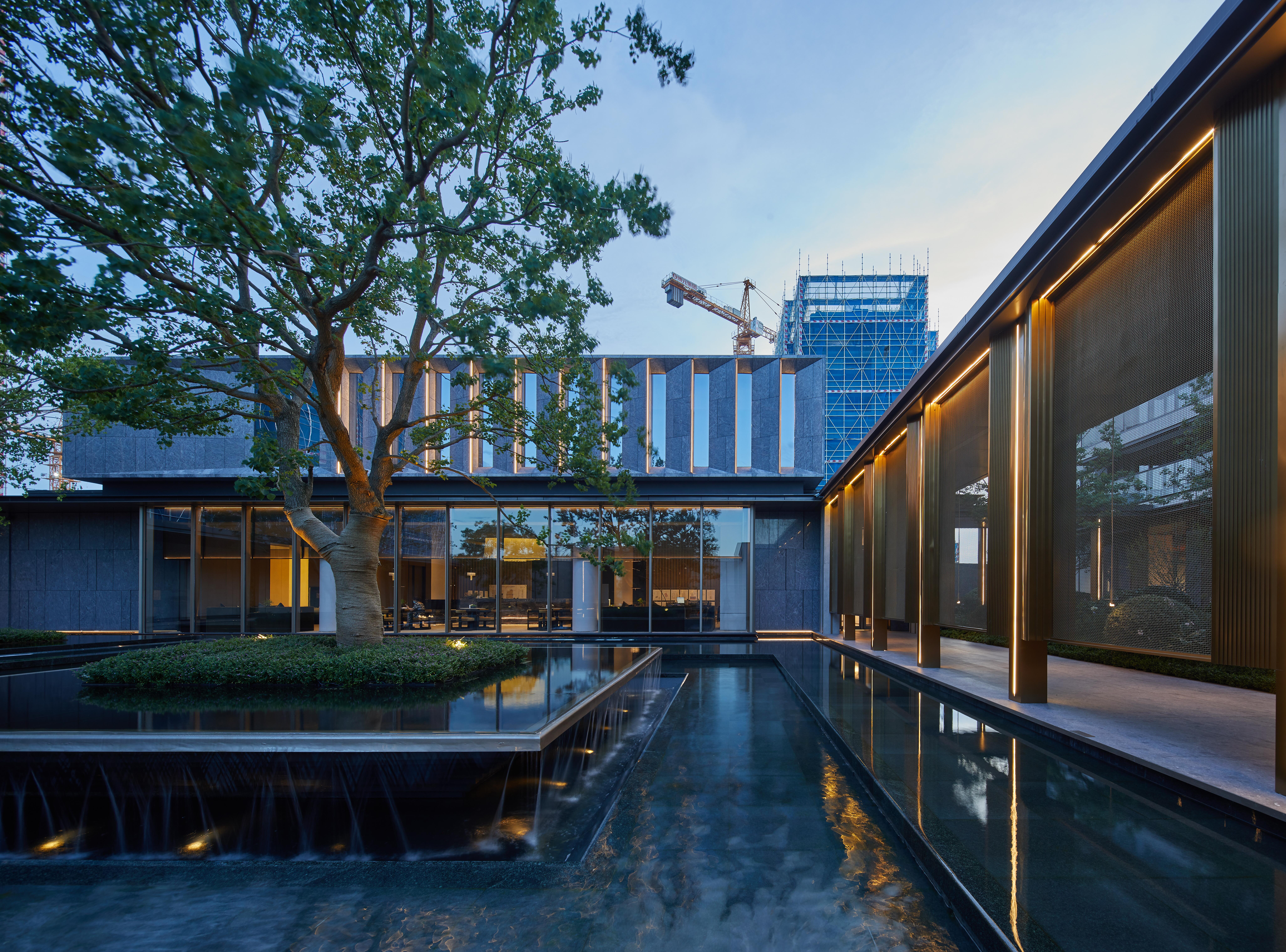 会客厅的室内均匀明亮,通过大幅玻璃营造室内的亲水休闲区,装饰帘在灯光下产生朦胧的遮挡,蕴藏着东方美学的含蓄内敛。